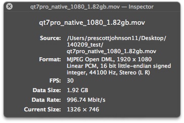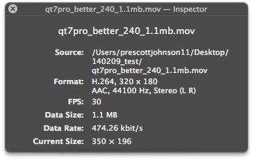 Here are the inspector notes on the QuickTime 7 Pro clips I made today. They were 15-16 seconds long. Named the files based on the app (qt7pro) followed by the quality setting in preferences, the image size and lastly the file size itself.
