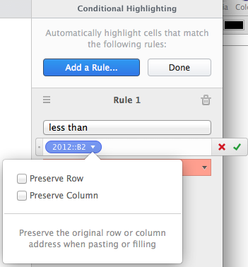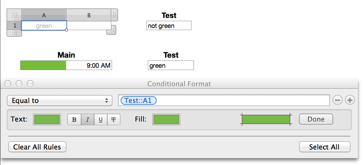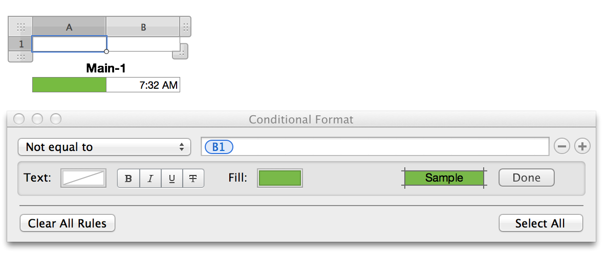 The selected table is Main. Main-1 is a duplicate of that table, with the same CF rule applied to cell A1. Content has been added to B2 to trigger the rule. Cell A1 must remain empty to prevent the green fill being applied when B1 is empty. (To me, that makes the earlier solution the more stable, and thus more desirable) one.