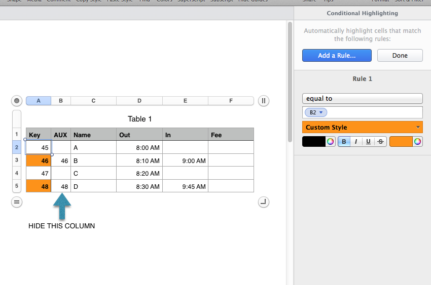 The conditional formatting rule for cells in column A compares the value in the cell with the value in the corresponding cell in column G. If they are the same (which they will be if a time has been recorded in column D) the rule applies a colour fill to the cell (in column A). The rule is the same as that shown in Jerry's example, except that it refers to G2 rather than B2.