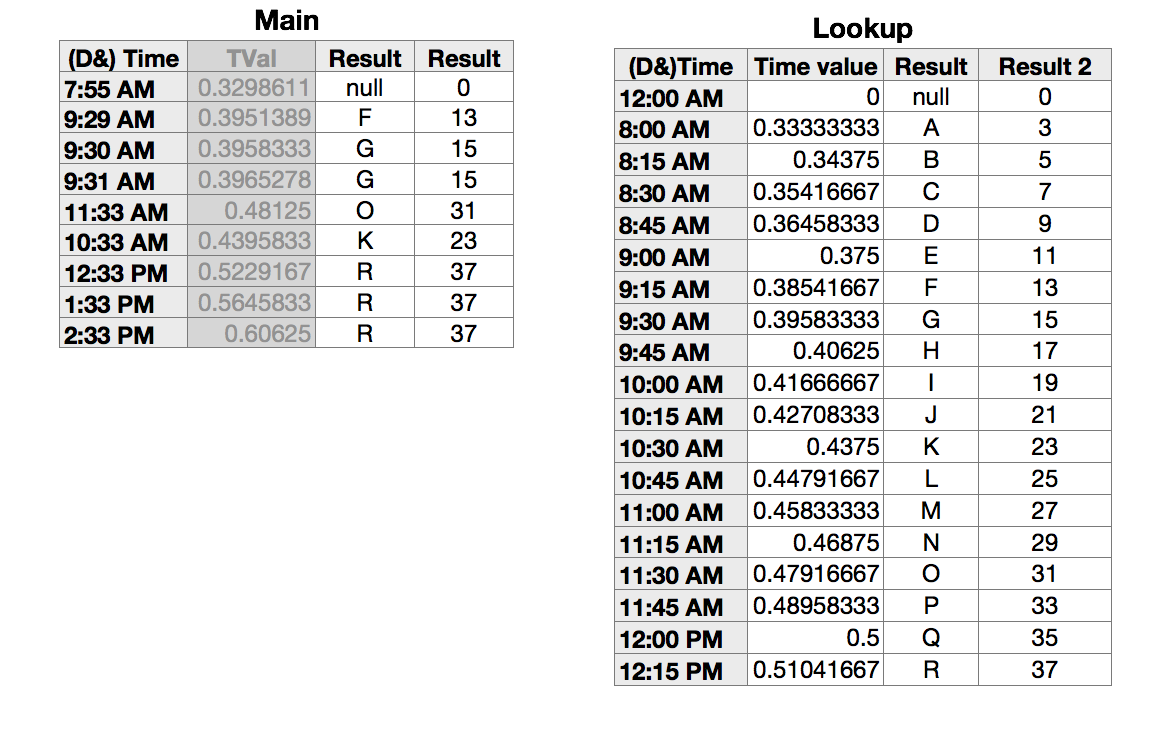 The column labeled "Tval" and the one labeled "Time value" contain numbers. The number is produced by the TIMEVALUE(date-and-time) function. TIMEVALUE() ignores the date part of a Date and Time Value, and returns the fraction of a 24 hour day represented by the time part of that Date and Time Value.