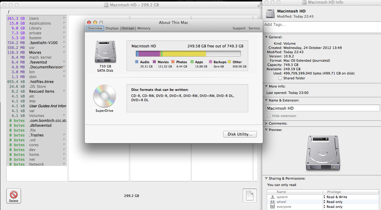 See this screen shot - I did a Omnidisk sweep (using sudo) and it tells me my HD had 300Gb of files yet the finder tells me im using 500Gb?!?!