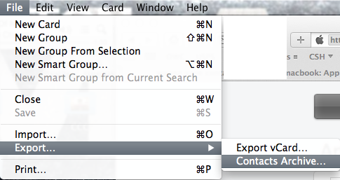 Unless you have a way to run the app and create the archive file on the 'broken' Mac system, there is no single archive file for Contacts.