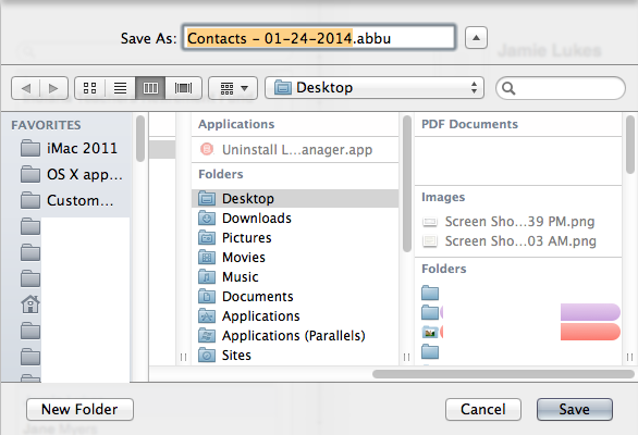 Then the Contacts app suggests a filename with the current date and the extension .abbu