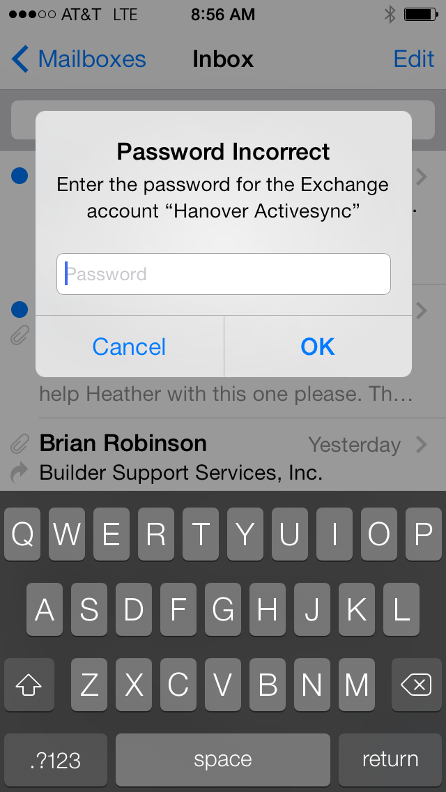I keep getting a pop up with the following message: "Password Incorrect", Enter the password for the Exchange "Hanover Activesync" account. However I already have the correct password permanently set in my Activesync profile. Seems to happen when phone has sat idle overnight. Our IT Department has wiped my phone 3 times and had me register my phone as new to no avail. I also appear to be the only person having this issue in my company. Help?