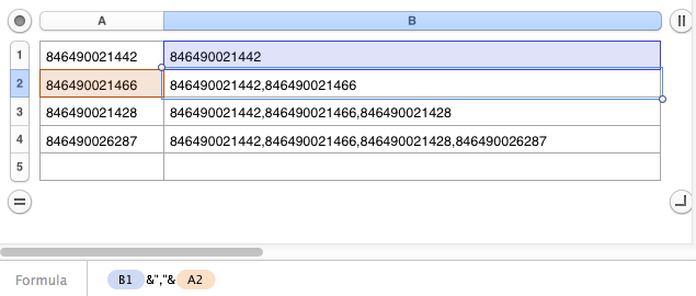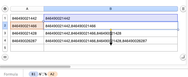 One simple way to use a spreadsheet to convert a column of values into a string separated by a comma all in one cell goes like this: