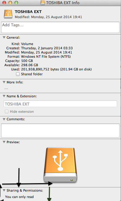 I have a Toshiba External hard drive, 1 TB, (I've only used 140.51 GB) that I have been saving files and photos to. A window would pop up asking me what I wanted to use the hard drive for, and I always click decide later. The other day I accidentally clicked a different option and now it won't let me put pictures on it anymore and says read only. Is there a way I can change this back to where I can save my photos to the hard drive without erasing anything off of it?