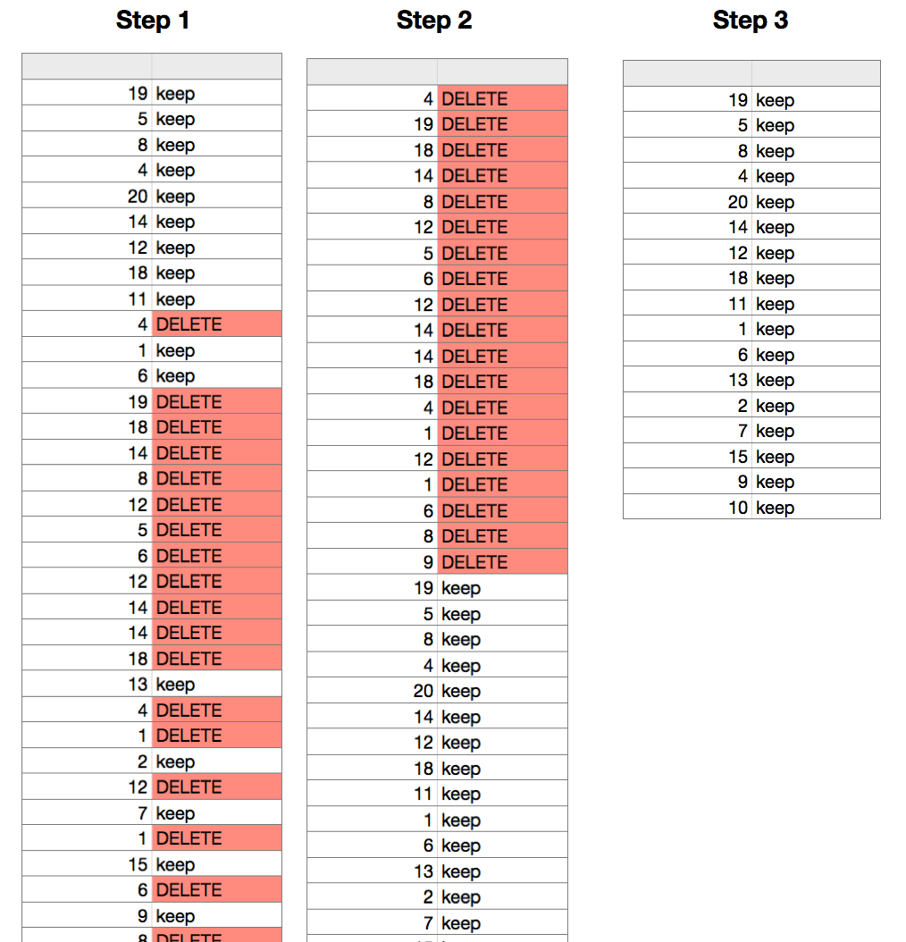 Step 2: Sort the table on column B to bring all DELETE results together.