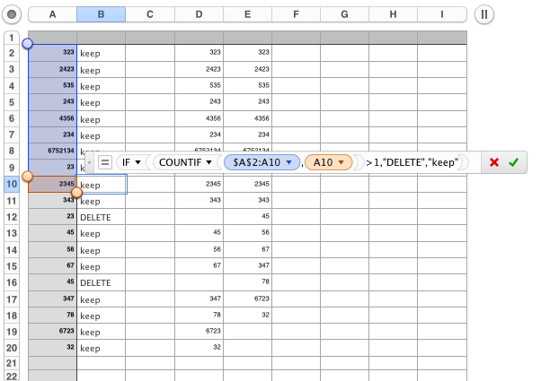 B2: =IF(COUNTIF($A$2:A2,A)>1,"DELETE","keep")