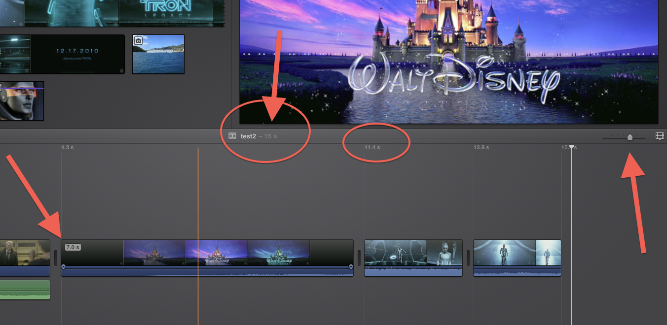 iMovie gives you the following 'numerical' data of your Project, allthough, a consumer edit.app should be based more on a simplified, 'iconized' user-interface: