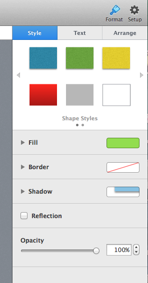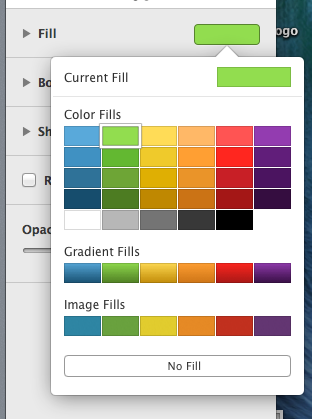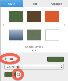 Thanks for trying to help me! I have OS X 10.9.1. Pages Version 5.1 (1769). I do not see what you are describing for fill. Here's is what I see: