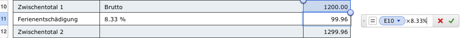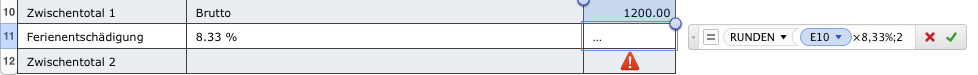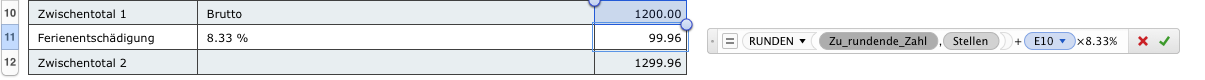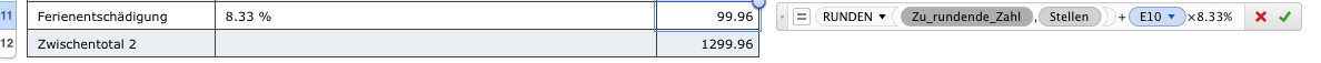 In my row E10 I have the sum of a calculation let's say 1'200.- CHF. From this sum I need 8,33% which gives me in row E11 the sum of 99.96. Now I need to round this up or down. I wanted to add "round" to my formula in E11 which says =sum(E10)x8,33% but it won't work. I'm a little bit frustrated because with excel I was very fast and good but with numbers it seem's I'm to stupid to check the formulas *grrrr