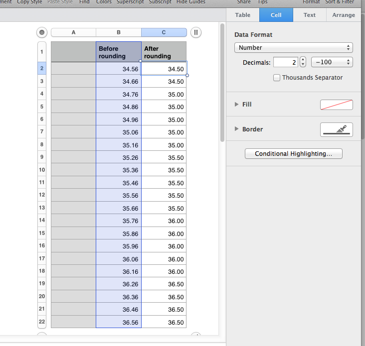 Hi I'm new with numbers but was good in excel. Now I try figure out how I can round costs in an invoice. For exampel: