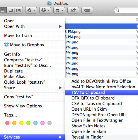 Or, perhaps easier, solve the problem at the source by using this self-installing TSV to Clipboard Automator Service. Select the tab-separated file in Finder (extension doesn't matter as long as the data it contains is tab-separated) and choose 'TSV to Clipboard' from the contextual Services menu: