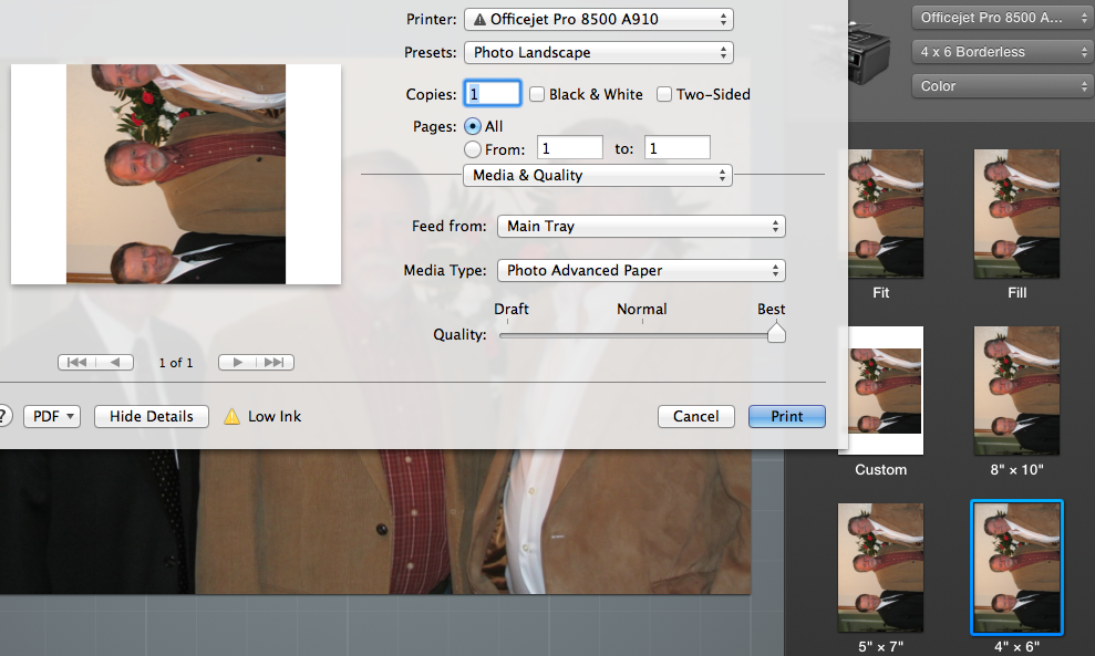 Help would be appreciated. All of sudden, with no other changes to my computer or my printer, when I try to print a photo to 4x6, 5x7, etc sized photo paper, the print is oriented to portrait, rather than to landscape. Can't find any settings to change the orientation. I've reset my printer to default factory settings. I've noticed that all of the print pre-sets in my computer are set to portrait, and I can't find a way to change the pre-sets. Very frustrating as I print quite a few pictures this way and have never had a problem. The only way I could print a 4x6 and get the whole picture is to print it on 8x10 paper. Thank you for any suggestions. Using MacBook Pro (2011), HP Officejet 8500 all-in-one, and iPhoto 9.5.1.