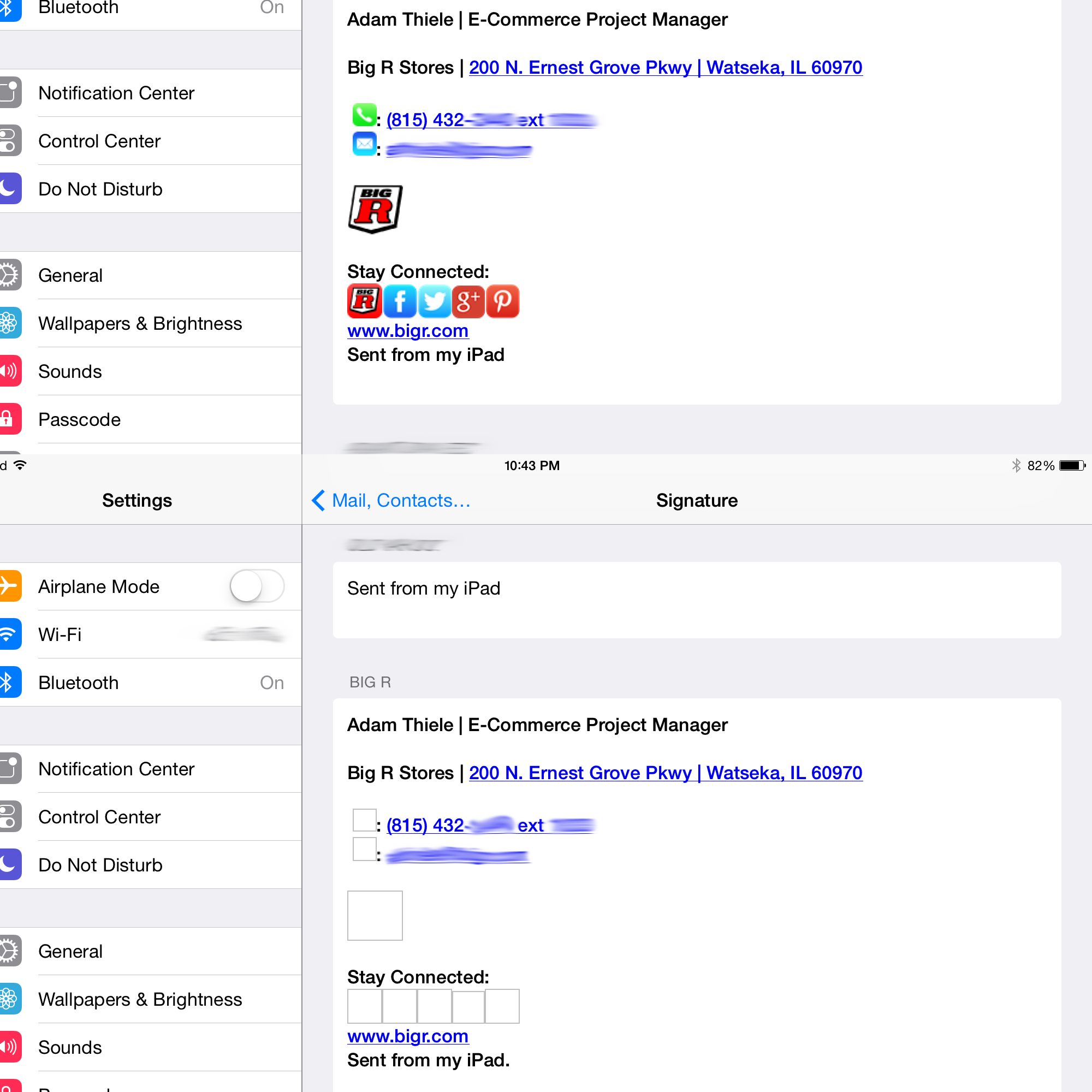 So my question is how can I use my html email signature on my iPhone and iPad with iOS 7.1 so the images do not turn into white boxes and stay exactly like I paste them in the email signature field?