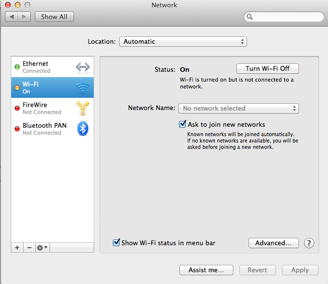 Open the Network pane in System Preferences and make a note of your settings in the Wi-Fi service. It may be helpful to take screenshots of the various tabs in the preference pane. If the preference pane is locked, unlock it by clicking the padlock icon and entering your administrator password. Delete Wi-Fi from the service list on the left by selecting it and clicking the minus-sign button at the bottom. Then recreate the service by clicking the plus-sign button and following the prompts.