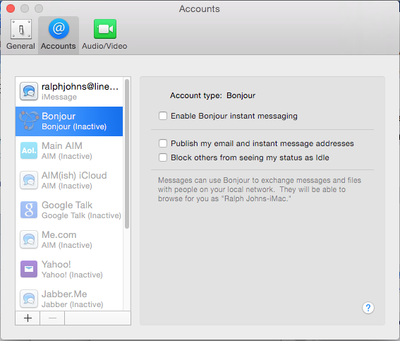 The iMessages one needs an Apple ID and the Bonjour one finds other Macs on your LAN and uses the Contacts app as your "Buddy Name" if you Enable it (it is Not Enabled by default).