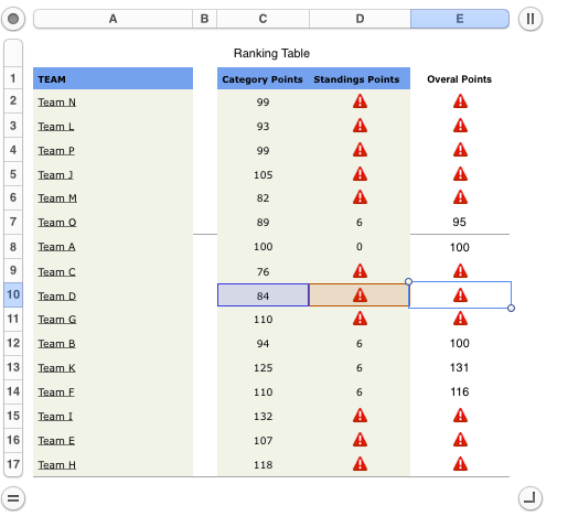 Column A uses the RANK function and the actual Standings points values in column C to determine the RANK of each team, according to it's Standings points total.