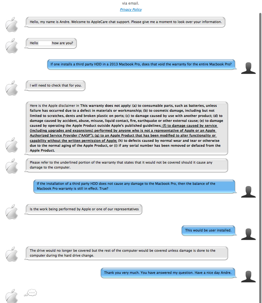 However, since my product info does say that both the hard drive and RAM are user serviceable, I feel that I am covered (by Apple's own language) by Applecare if I swap the hard drive which I did. FWIW, there were no seals or anything - it was a straight forward unscrewing the enclosure and replacing the drive.
