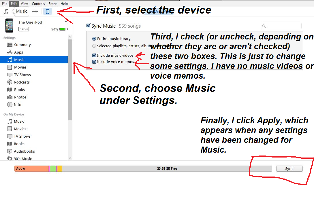 5. After this action is performed, the option to 'Apply' will appear in the lower right hand corner of iTunes, which will apply the changed settings to the device, along with syncing all available music and album artwork, etc.