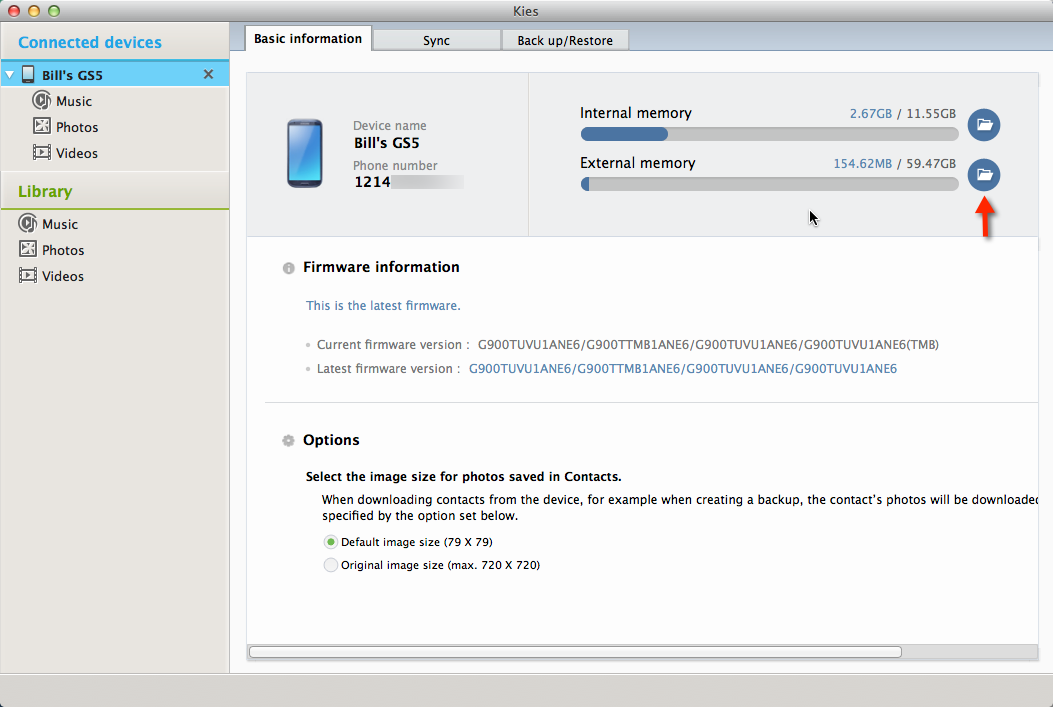 Connect your GS5 to your Mac via USB3 cable & make sure phone screen is unlocked. Now launch Kies. Once your phone is detected, click to select your phone in the nav bar on the left. In the main window on the right, you'll see lots of information about your phone, including memory in use (both internal & SD card):