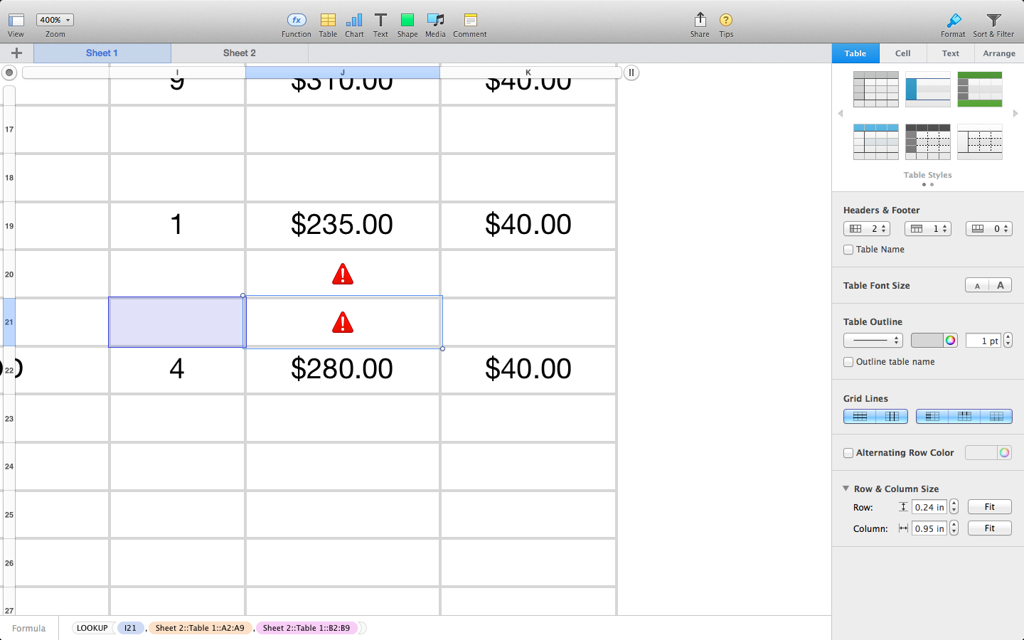What i did was create a formula in each cell and copied it. The formula works great, when there is a number in the cell to the left, but when the formula cell is empty i get the warning triangle. How could i hide the warning?