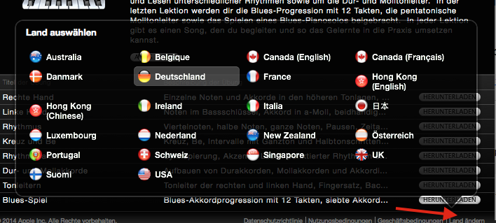 You can change the country for the store in the lower right corner of the Lesson store window: