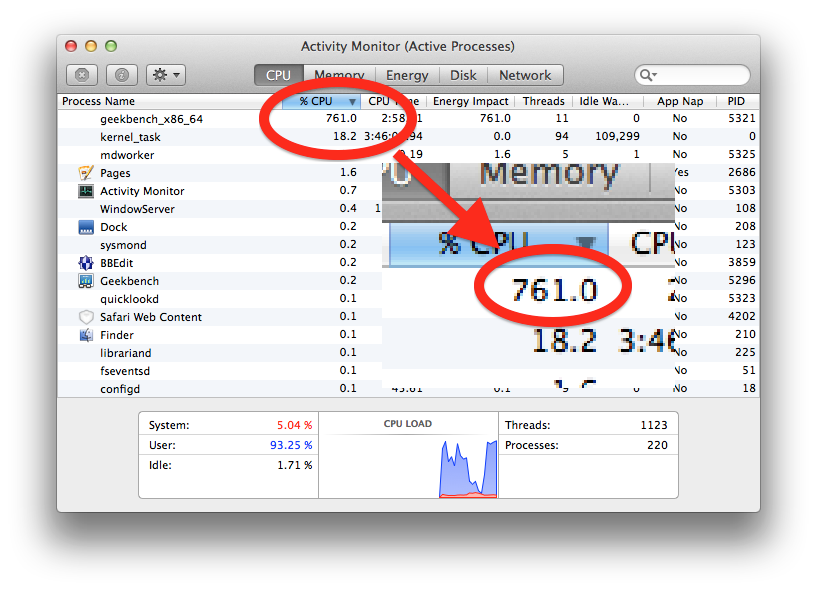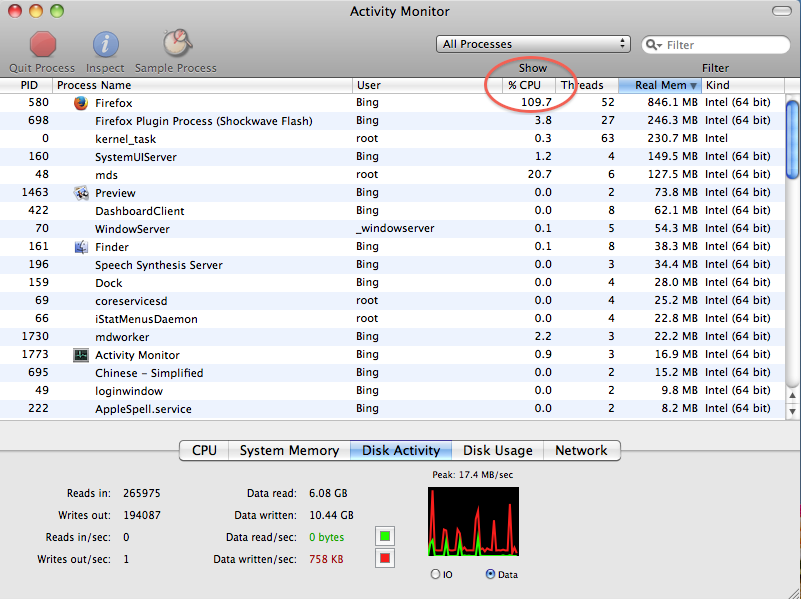 I got a bit confused about the percentage number of processor usage shown in Activity Monitor, as its value could be higher than 100%. For example, in below screenshot, the CPU usage for Firefox is 109.7%. Actually the value was even higher, I just wasn't able to capture it when I was capturing the screen.