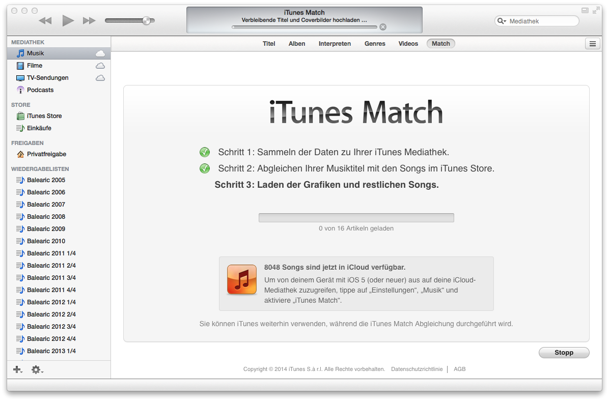 I've been using iTunes Match for about a year and a half and have started experiencing a new problem in the last couple of days. I've added a few new tracks to my library over the last couple of days and have attempted to "Update iTunes Match." However, the matching process is stalling out at the end. It looks like it's just about to finish but then it never does. I have downloaded the most up-to-date version of iTunes, I have stopped and restarted the "Update iTunes Match" process numerous times. I have closed and reopened iTunes several times. I have restarted my computer and started over. Etc. Etc. and the same problem keeps occurring. Last night, I let the matching process continue overnight and it still had not finished in the morning. I am at my wit's end at this point. It's only 11 new songs that I'm trying to get iTunes to Match. Does anyone have a suggestion as to how to resolve this problem? Thanks!