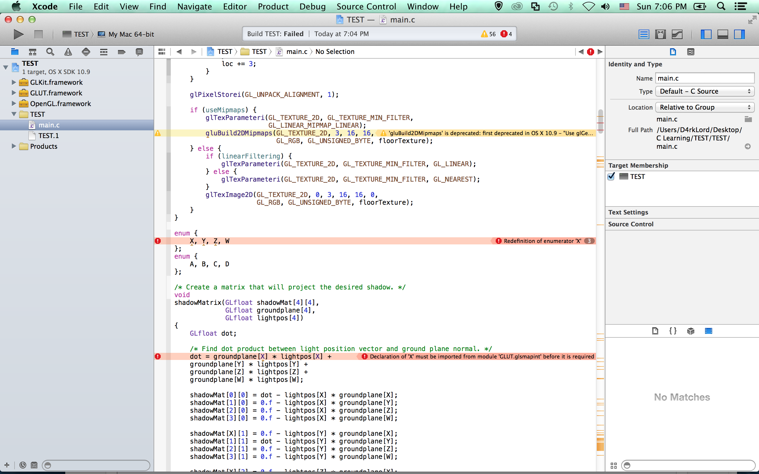 At this point the basic question of using the GLUT and OpenGL frameworks seems answered. For individual problems with specific examples from that site you will need to try to debug it or else search for an answer.