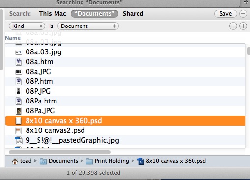 OK. again, your recommendation was to open the parent folder and type CMD + F. in my case this does not bring up the image you show as i indicated in my last post (it brings up This Mac, All My Files and Shared as i have indicated). so again, i am going to recommend that you advise others as i have indicated in my follow up post. since you've been very helpful in a pretty reliable way i am not sure why you would be resistant to advising others in this manner in the future.