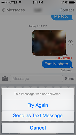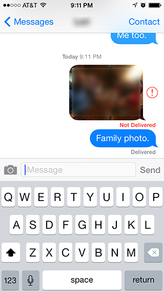 Every time I try to send a photo to my one friend, it looks like the photo goes through but I always get the "Not Delivered" error message about 10 seconds later.
