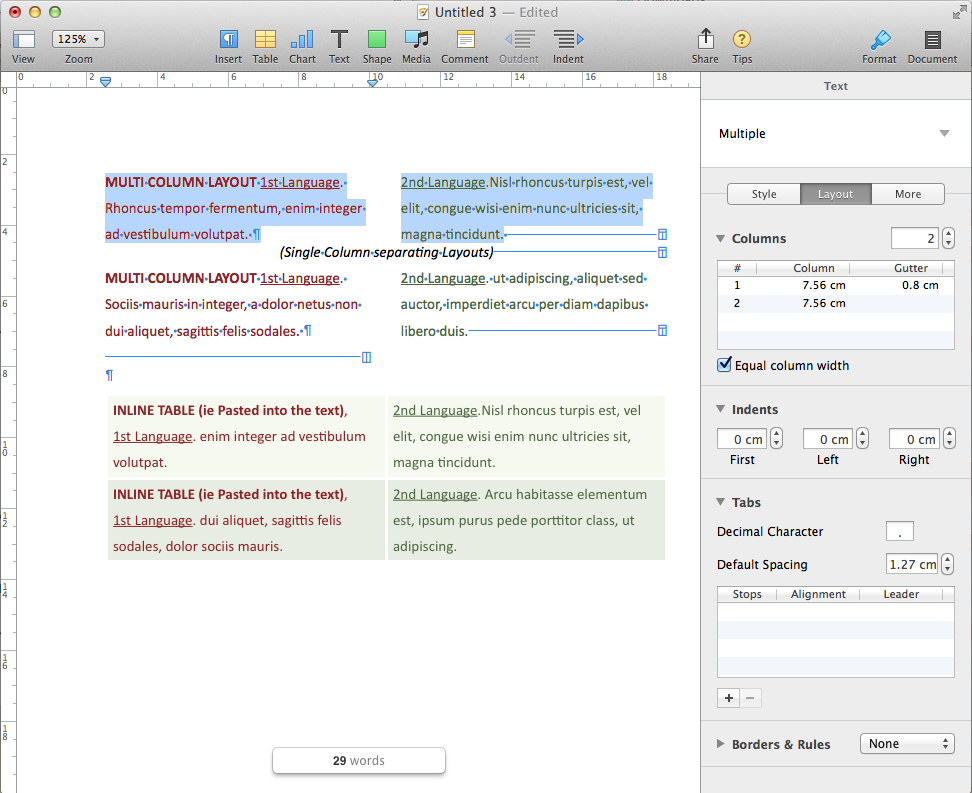 Then follow that with a return which you change back to a single column (just to separate the layouts). Then do the same again, multi-columns followed by another single column layout. You have to do this to get them to separate due to the weirdness that is Pages 5.