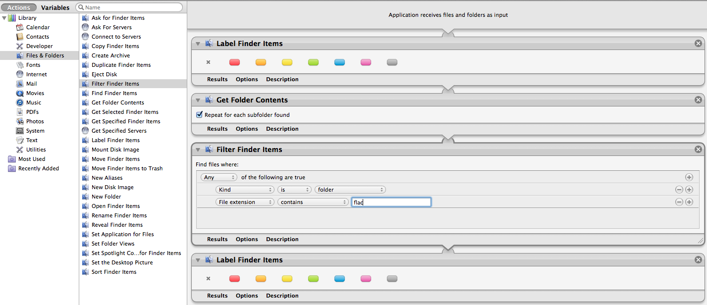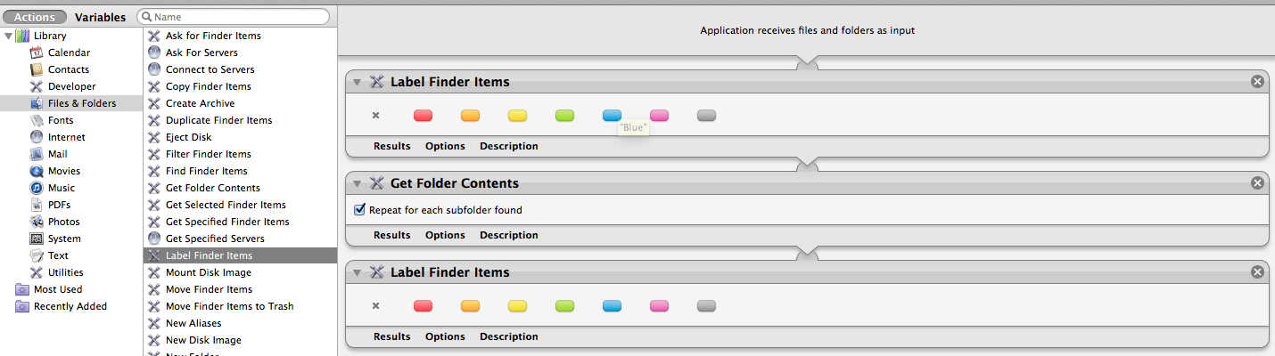 And in case the script using Finder turns out to be too slow for processing large directory tree, you may try the following AppleScript script which is a simple wrapper of rubycocoa script. It requires OSX 10.6 or later. It will behave the same as the script above except that the label index for each colour is different than that for Finder. Indeed label index number is quite a mess and not consistent through different APIs, namely Finder, Cocoa and shell (xattr).