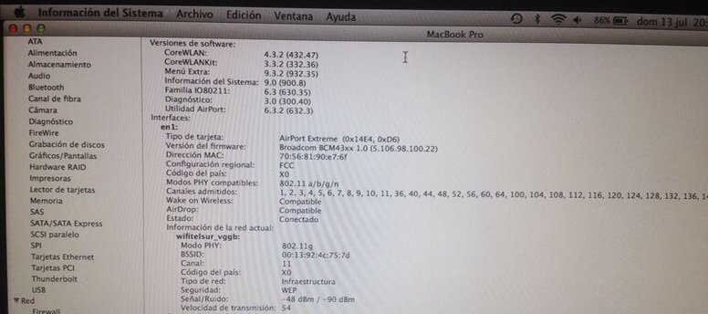 Interfaces: en1: Tipo de tarjeta: AirPort Extreme (0x14E4, 0xF5) Versión del firmware: Broadcom BCM43xx 1.0 (5.106.98.100.22) Dirección MAC: a8:bb:cf:03:d2:10 Configuración regional: FCC Código del país: LA Modos PHY compatibles: 802.11 a/b/g Canales admitidos: 1, 2, 3, 4, 5, 6, 7, 8, 9, 10, 11, 12, 13, 36, 40, 44, 48, 52, 56, 60, 64, 100, 104, 108, 112, 116, 120, 124, 128, 132, 136, 140 Wake on Wireless: Compatible AirDrop: Compatible Estado: No asociado |