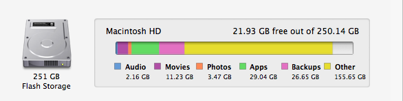 A few weeks ago, that yellow bar used to be pink (indicating Backups). At that point, I got the "Your startup disk is almost full." message, and after making sure all my files were backed up, I executed the
