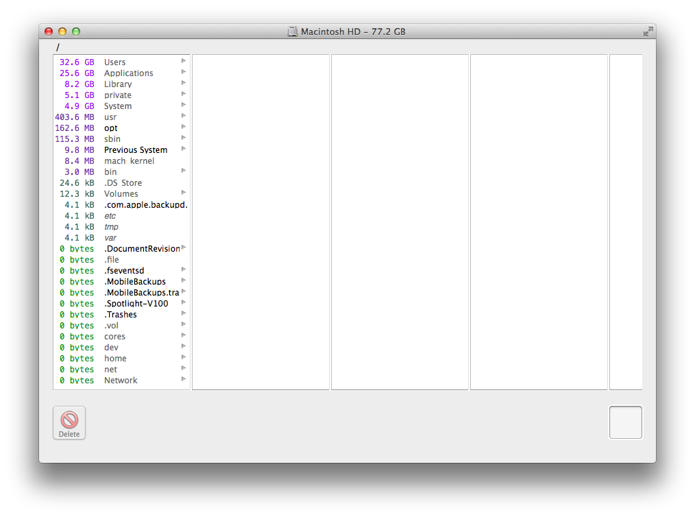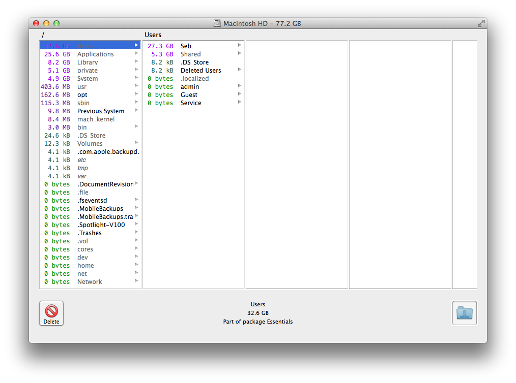 If you do the math (or just look at the title bar of the window) it says that I have 77.2 GB of space used up. Unfortunately, you have to realize that it actually didn't scan everything. The software's being honest: if it can't see a file, it takes up no space (0 bytes). For instance, take my users folder: