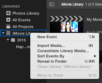 Pesky, though, because you can only create an event when you have clicked on "iMovie Libraries" in the left hand bar. Give that button a right click and you will see "New Event" a now viable option. Once you create an event, you should be able to add a project to that event.