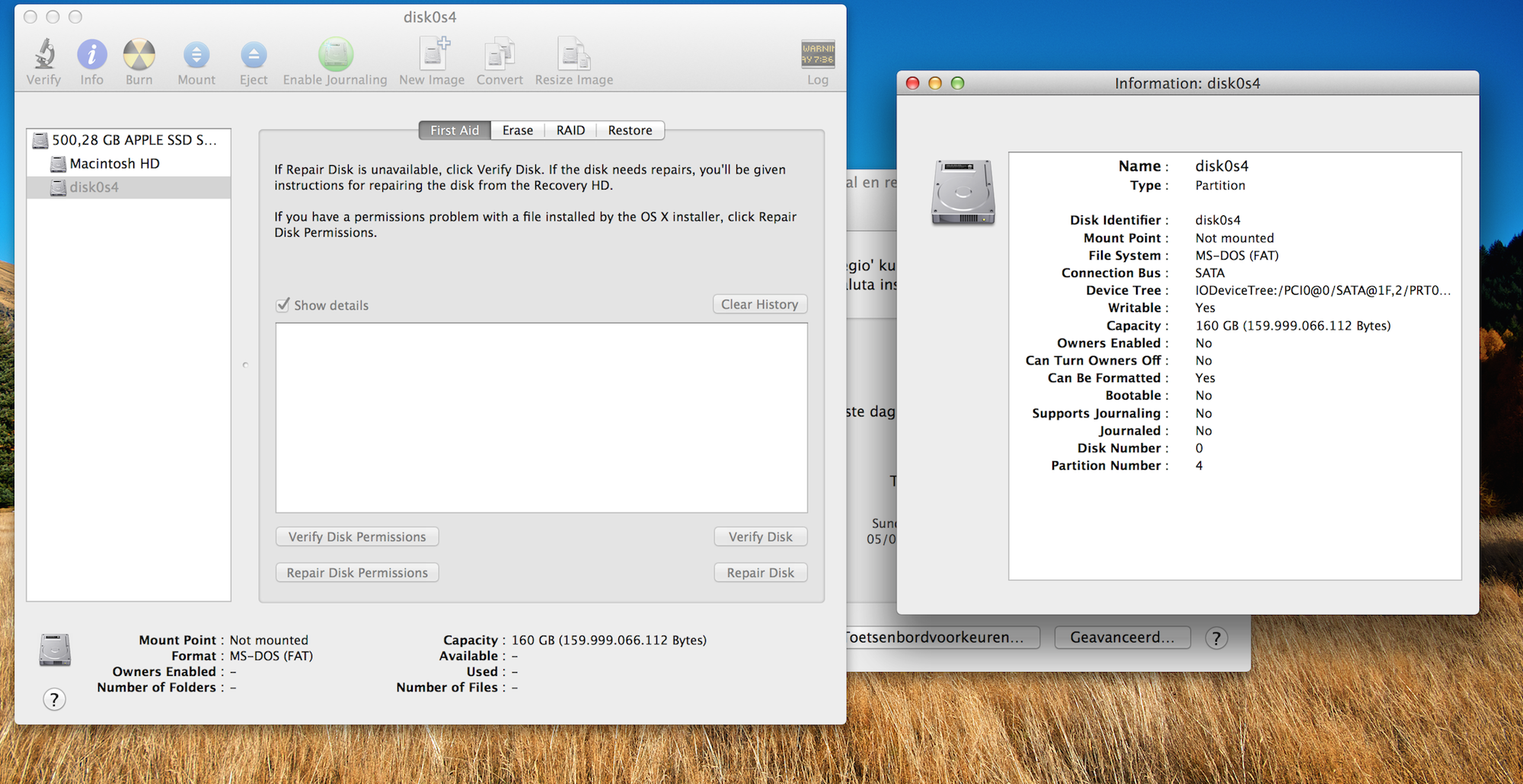 down so it had more space. Everything worked (Windows as well). In a early screenshot i saw the original size of Macintosh HD before the whole partition problem. It was 4 GB larger . I was stupid enough to enlarge the Macintosh HD with 4 GB to return it to the original size. Now Bootcamp changed into Disk0s4 and is greyed out. Windows does show when pressing alt/option but when i boot into windows it says: missing operating system. Is there any way to fix this?