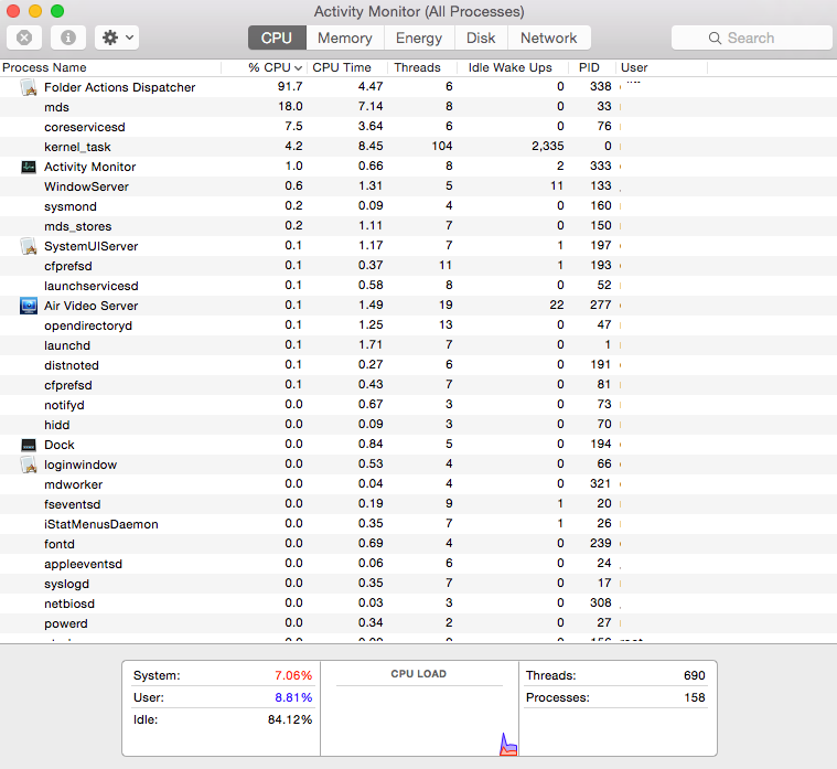 Folder Actions Dispatcher sits in memory, and grows and grows until it consumes over 2 GB. It will typically ask for as much as 50% of the CPU as well. Then it usually crashes, but not before consuming the RAM that should be available for other applications.