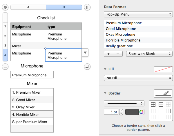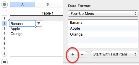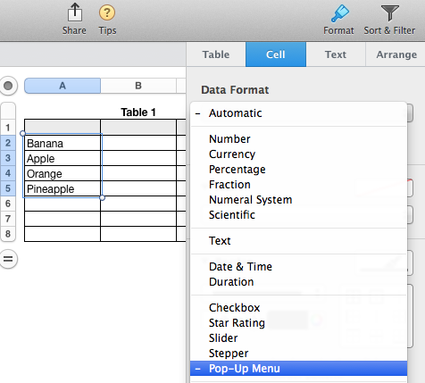 Creating a Pop-Up Menu in Numbers 3 is very easy.