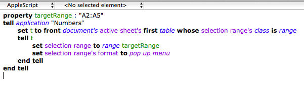 A2 to A5 selected. In AppleScript Editor I pasted the script and clicked on the hammer to compile.