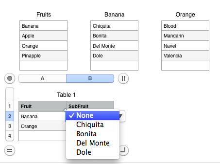 The result should be Pop-up Menu cells in column B whose items depend on what was entered in column A.