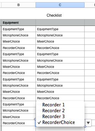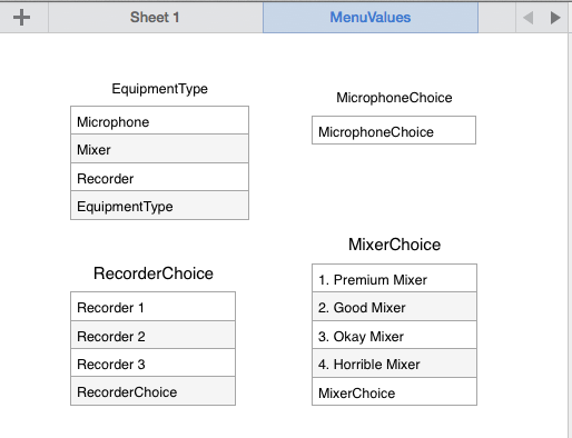 Since the script only takes the last entry in the table I tried using "Microphone" as a single cell table. While I don't see it as best practices, I would be tempted to just edit the popup there. And it propagates to wherever Microphone is in column A. As a note, the mixer table's last cell is a popup with the blank chosen.