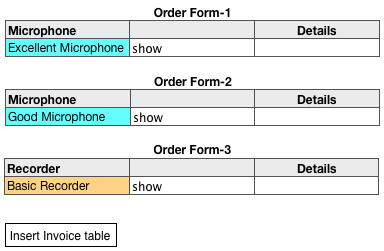 I am now thinking of several tables in one document, each table for one order. Include a summary table (Invoice).
