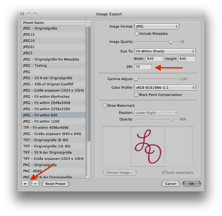Now you can select a custom pixel size or dpi setting, add a watermark, change the jpeg quality.