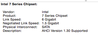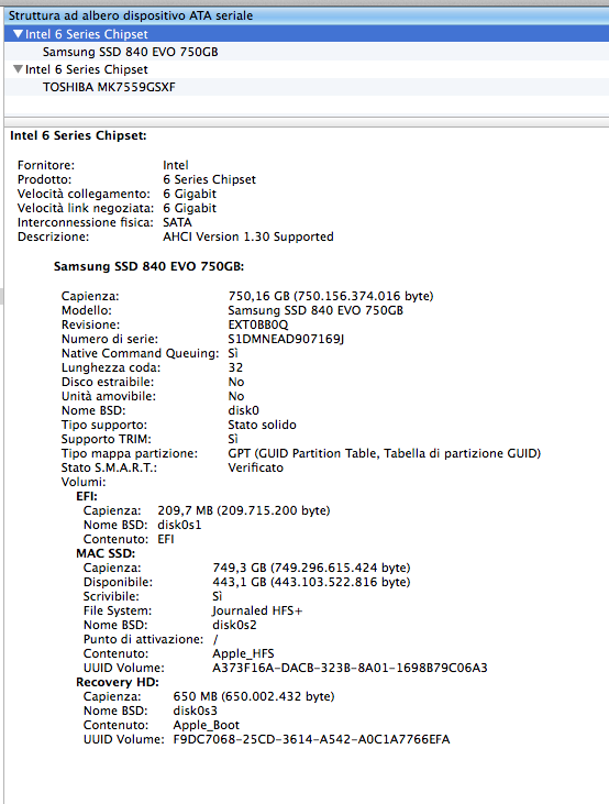 I have a Macbook Pro 17" i7 2,2 Ghz (early 2011 OSX 10.9.4) equipped with a 750 Gb Samsung SSD and a Secondary 750 Gb Toshiba HHD mounted in place of the Original Laptop's DVD optical Drive.