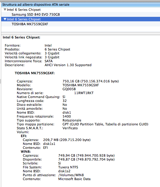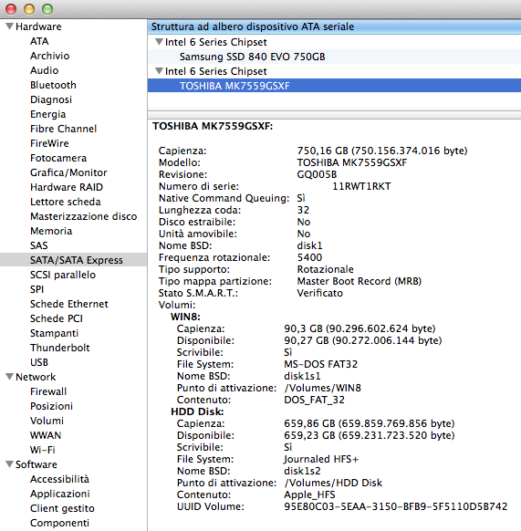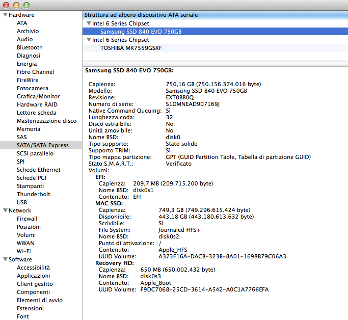 I have a Macbook Pro 17" i7 2,2 Ghz (early 2011 OSX 10.9.4) equipped with a 750 Gb Samsung SSD and a Secondary 750 Gb Toshiba HHD mounted in place of the Original Laptop's DVD optical Drive.