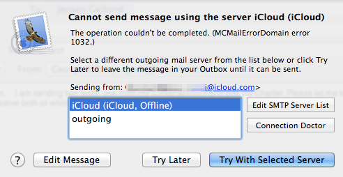 Trying to send an email in Mavericks Mail from iCloud account and got the following error: MCMailErrorDomain error 1032.