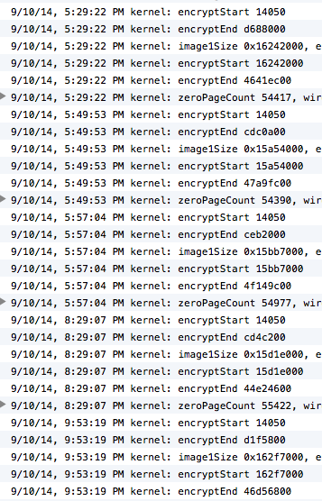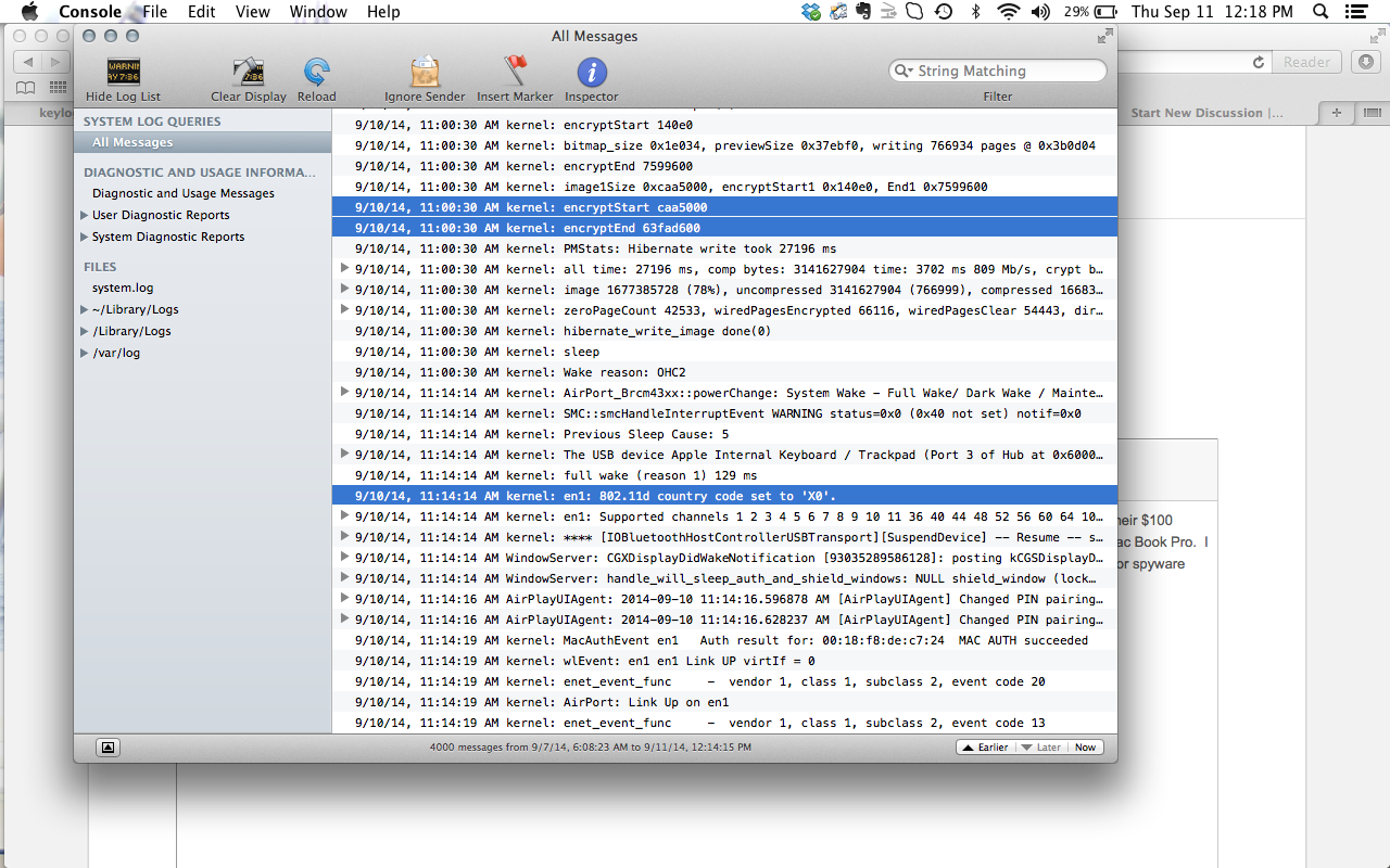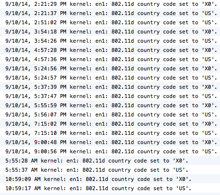 There is no Apple Store genius bar located in my state (MT) so that is not an option until I fly somewhere else. I checked Thomas Reed's site and there is no specific information on identifying key loggers. I'll keep searching his site though. Does the highlighted code above prompt you to possibly believe that I do have a key logger? For example the line that states [9/10/14 11:14:14.000 AM kernel[0]: en1: 802.11d country code set to 'X0'.]